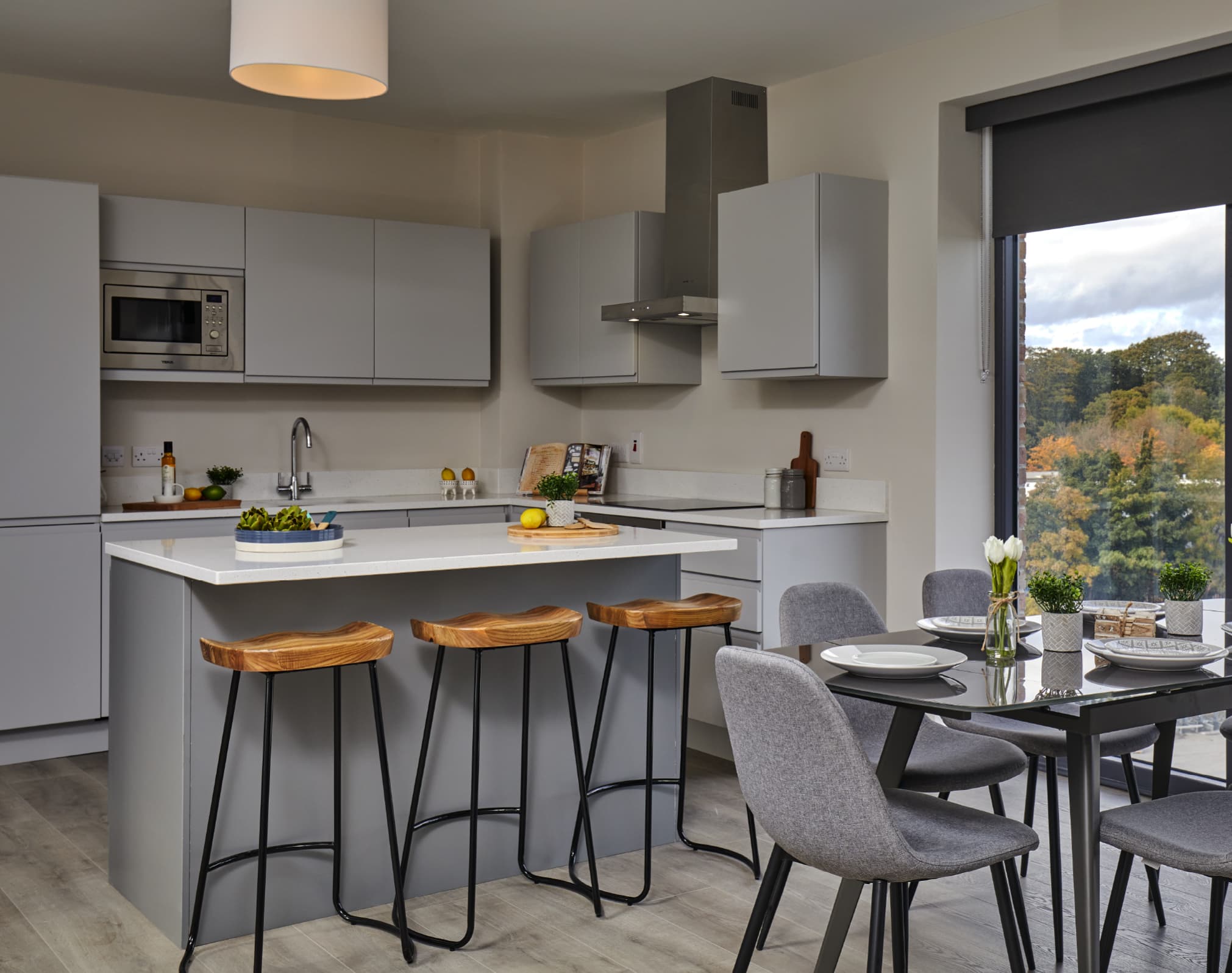 Sleek solid worktops and great storage; High-quality kitchen appliances including dishwasher, fridge/freezer and combi oven.